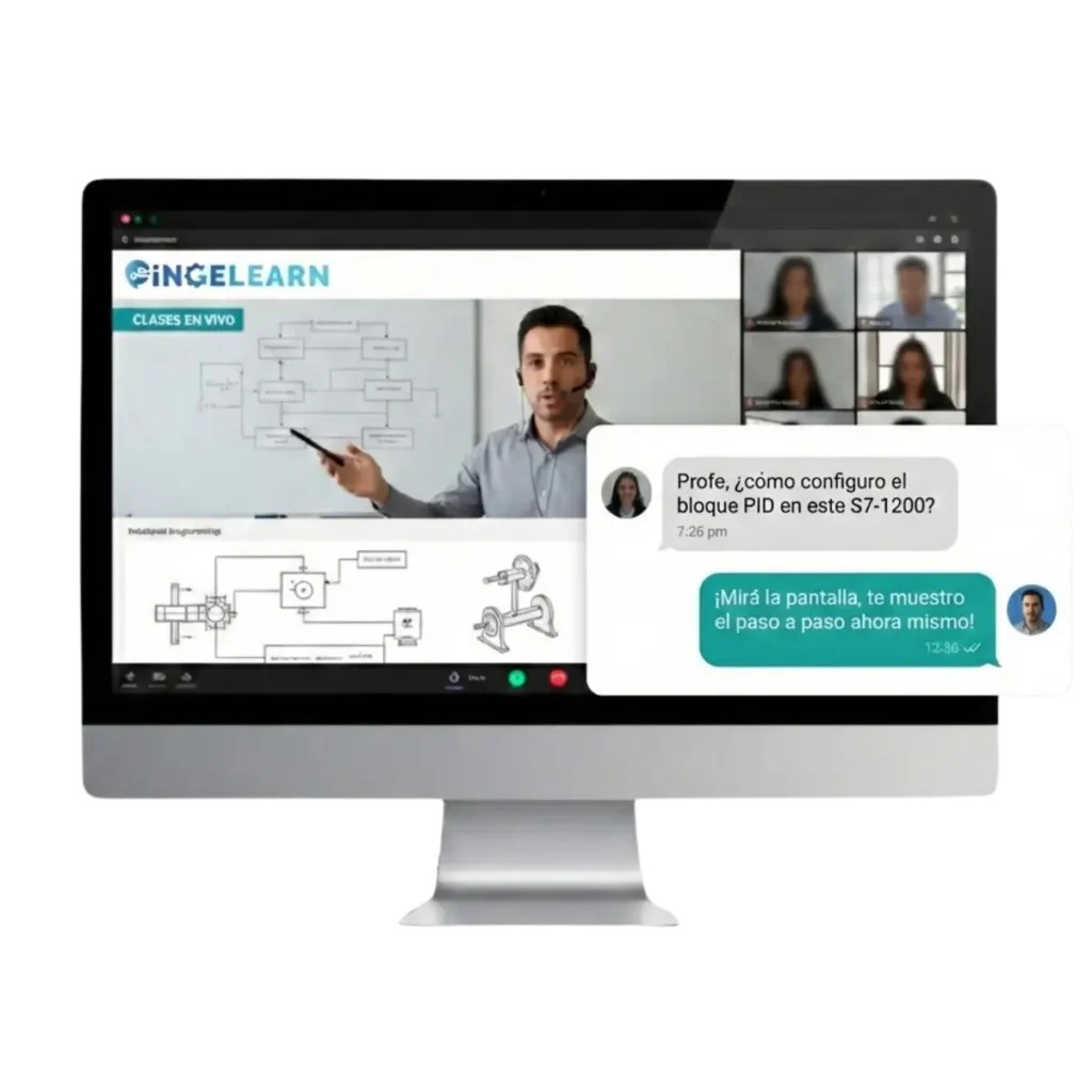 Accede a clases en vivo impartidas por ingenieros con experiencia real en planta. No pierdas más tiempo buscando soluciones en foros; resolvé tus dudas técnicas cara a cara con el profesor. Aprendé con casos prácticos y contenido actualizado para avanzar en tus proyectos industriales sin interrupciones.